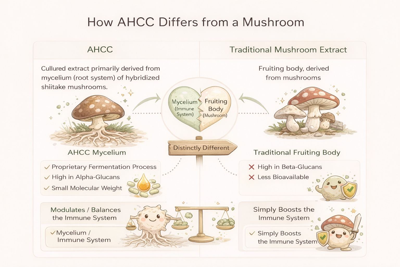 Furthermore, AHCC modulates the immune system, rather than boosting it like traditional mushrooms.